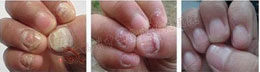 5、甲板变脆易碎:由于真菌侵入甲板和甲床,角质颗粒呈粉末状易于脱落、松散而变得碎杂。